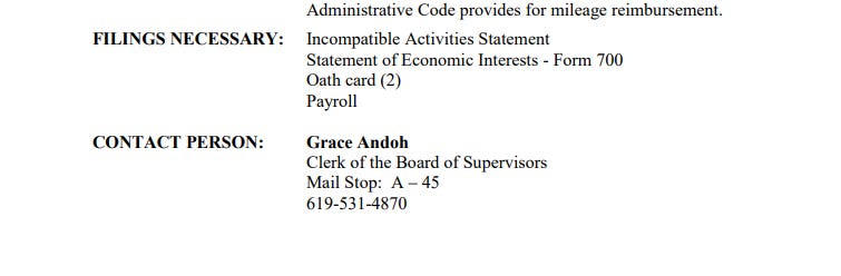 They are handled differently depending on what board, committee, or commission it is. For example, Assessment Appeals Board and Civil Service Commission require a Form 700 and a Form 519. Behavioral Health Advisory Board doesn't allow individuals to serve if they work for an organization that receives County BHS contracts, with few exceptions. Amanda recommends that individuals reach out to her or the contact listed on the fact sheet for the specific Board or Commission. The fact sheet will generally state the filings necessary. This is a screen capture from the Assessment Appeals Board fact sheet as an example.