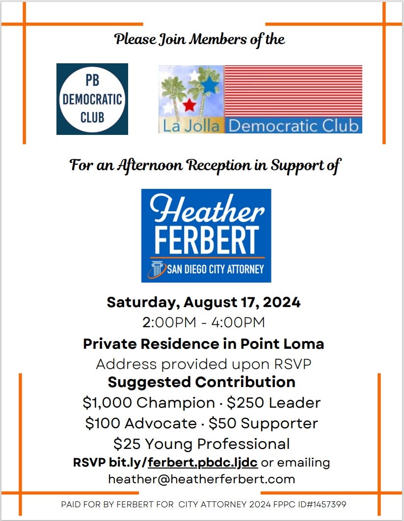 Please join us for a fundraising event on Saturday, August 17th, from 2 - 4 pm, to support Heather Ferbert’s campaign for San Diego City Attorney.