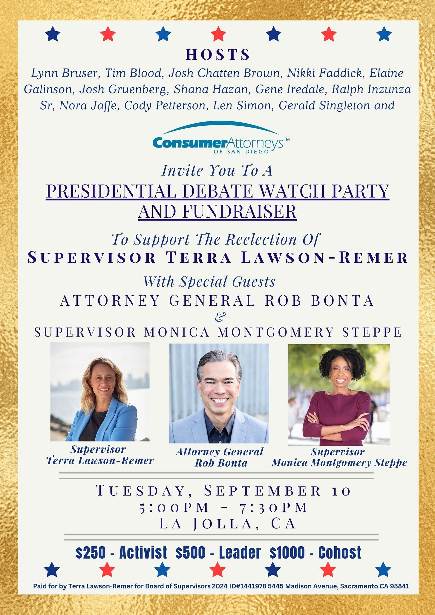 Please join us for a fundraising event on Tuesday, September 10th, from 5 - 7:30 pm, to support Terra Lawson-Remer’s campaign for San Diego County Board of Supervisor.