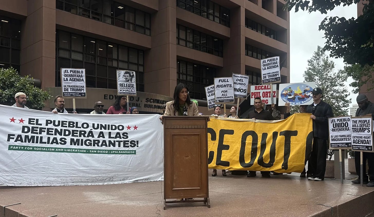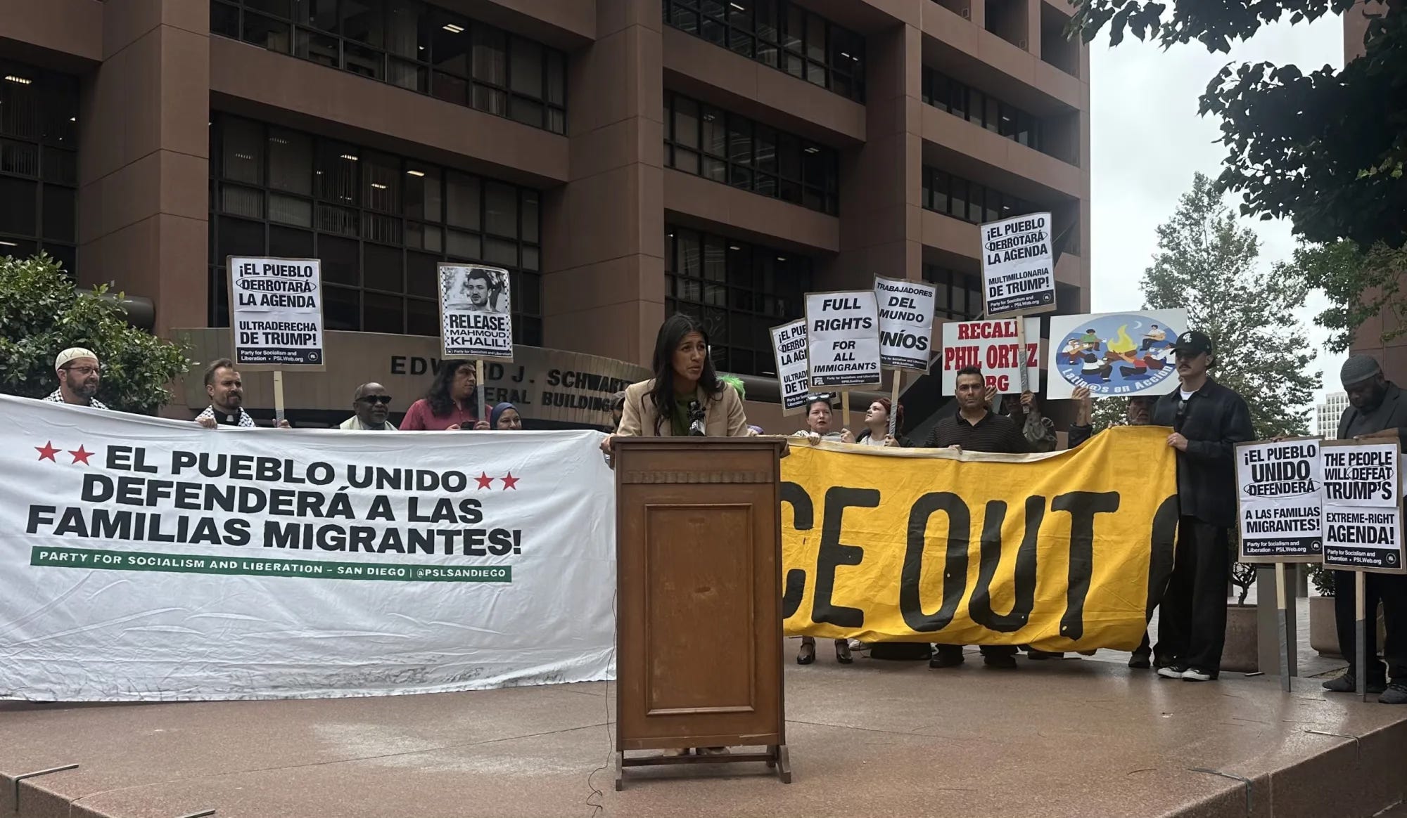 Immigration attorney Valerie Sigamani speaks out against ICE raids in San Diego. (Photo by Gabrielle Wallace)