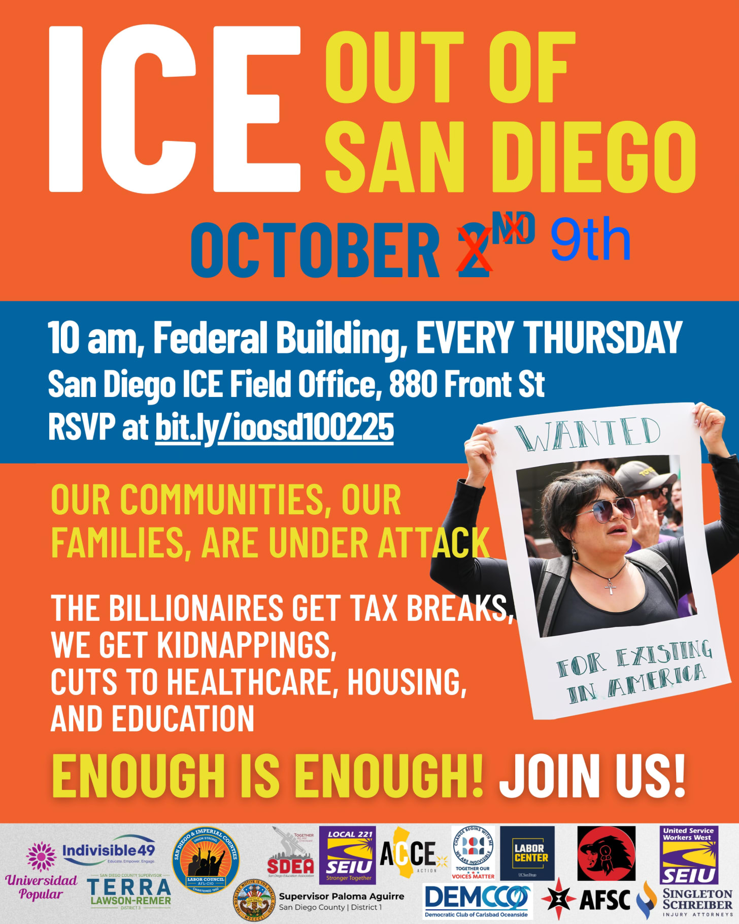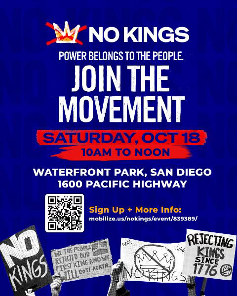 San Diego’s main event will be at Waterfront Park, from 10am - noon. Please RSVP here (and learn more about the event here). We encourage you to make the trek to Waterfront Park in downtown San Diego if you can -- we hope to exceed the 80,000 marchers that came together for NO KINGS 1.0 on June 14. If you can’t make it to Waterfront Park, you can participate at one of the hundreds of other events planned all across the country.
