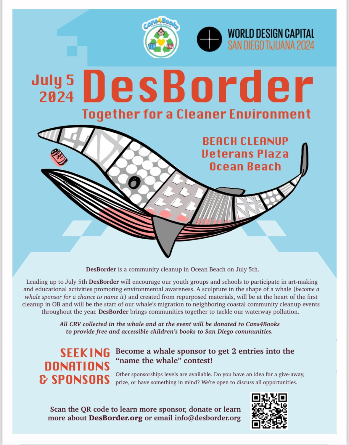 A sculpture in the shape of a whale (want a chance to name the whale?) and created from repurposed materials, will be at the heart of the first cleanup in OB and will be the start of our whale’s migration to neighboring coastal community cleanup events throughout the year. DesBorder brings communities together to tackle our waterway pollution. Learn more about the project here.
