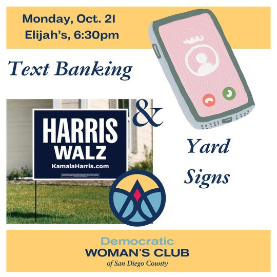 Help protect the democratic majority in our county! The Democratic Woman’s Club of San Diego County will meet at Elijah’s on Monday, October 21 at 6:30 pm and we'll be texting in support of Supervisor Terra Lawson-Remer. We’ll utilize the Outreach Circle app, which is fun and easy to use.