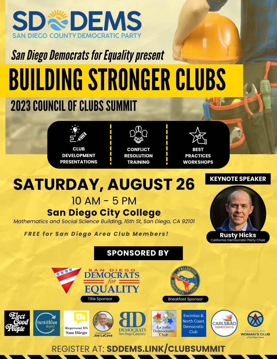 This month, we will be having the Democratic Club Summit on Saturday, August 26th from 10 am - 5 pm at the Math and Social Science Building of San Diego City College. Please register for the event here. Please come and meet your fellow democratic community members and leaders.